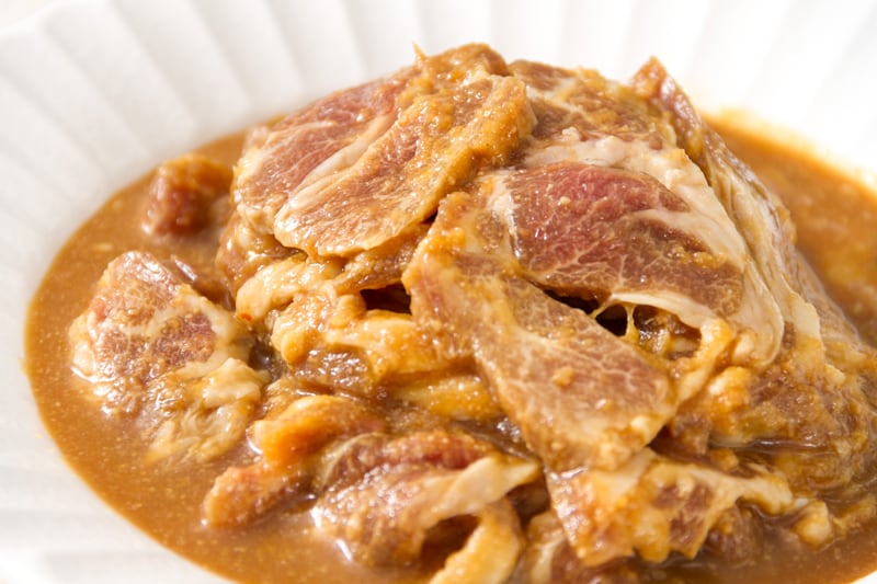 羊肉(オーストラリア産)、醤油、中ザラ糖、りんご、生姜、はちみつ、水飴、にんにく、オレンジ、玉ねぎ、人参、ピーナッツ、酒、味噌、赤ワイン、みりん、すりごま、豆板醤、カレー粉、コショー/乳酸、香辛料抽出物、花椒、カラメル色素(一部にりんご・オレンジ・小麦・大豆・落花生・ごまを含む)