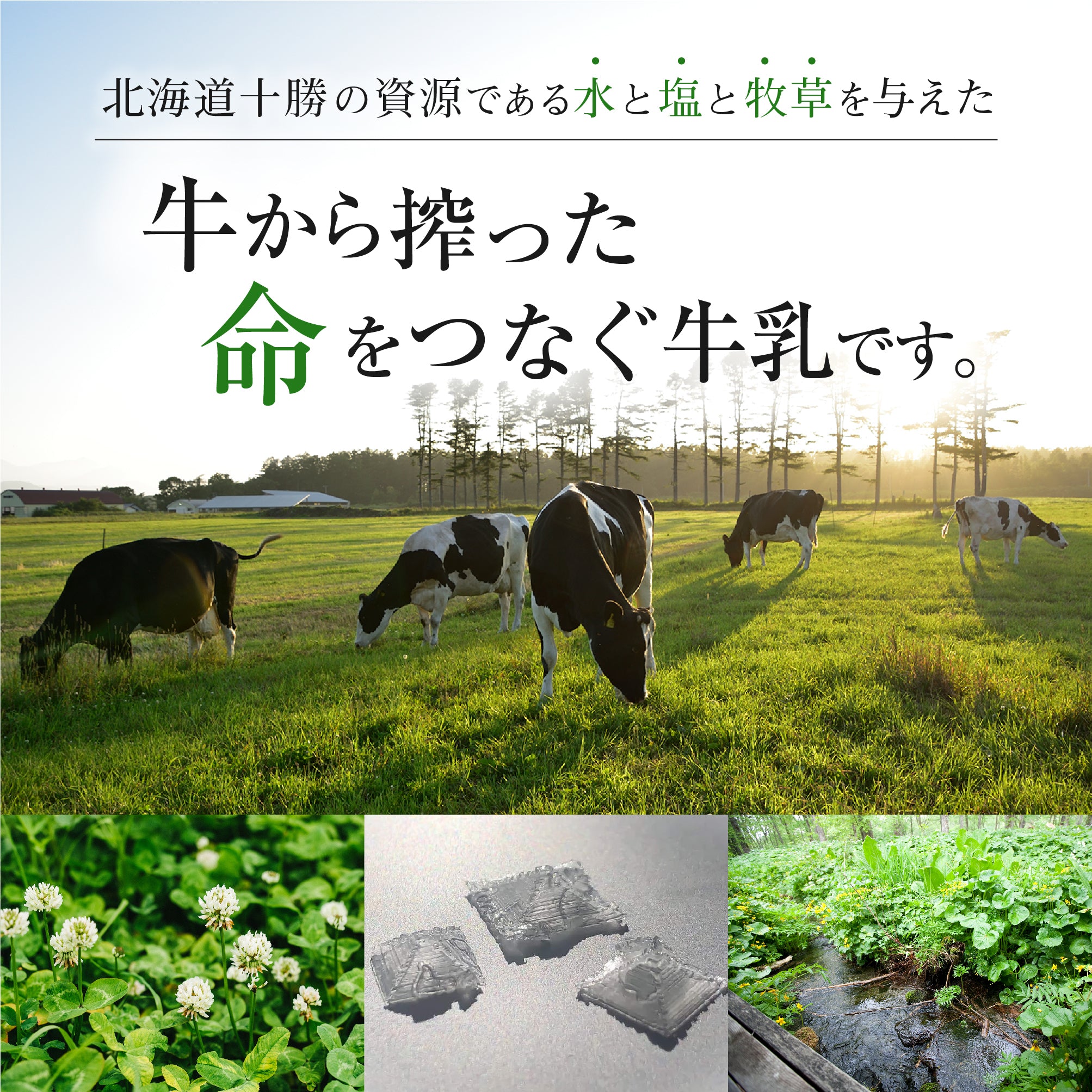 日高山脈のふもと、豊かな水脈のもとで掘った地下水を飲み、太平洋から海風に乗って運ばれるミネラルにより滋養豊かに育った牧草を食べ、広尾町沿岸の海水から作った塩を舐めて育った牛が生み出す牛乳。ワインのように地域特性のある「テロワール牛乳」をお届けします。