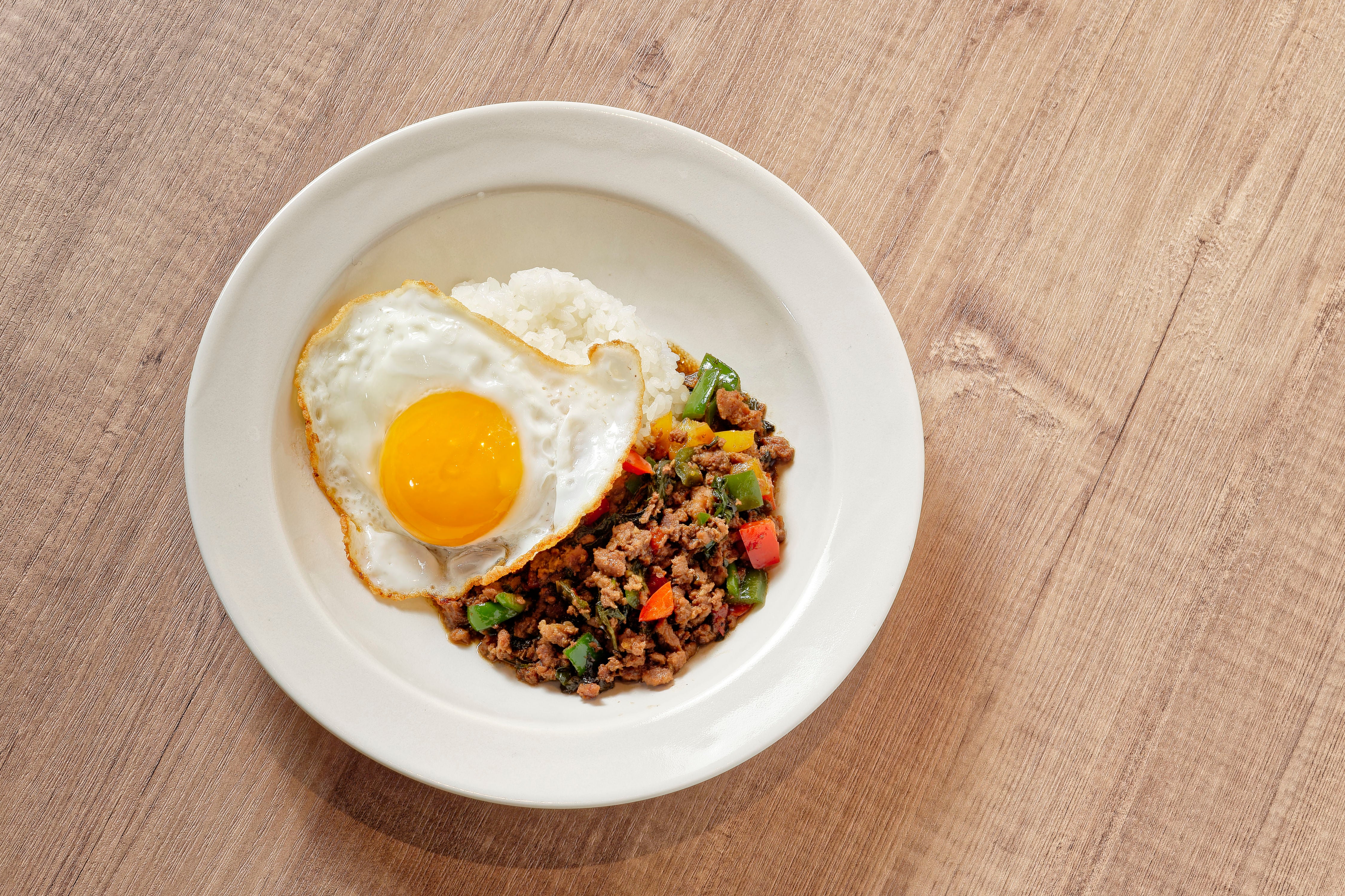 ②ガパオ各種は、ご飯に盛り付け、具材はお好みで半熟の目玉焼きを添え、混ぜて食べるとより本場の味わいが楽しめます。