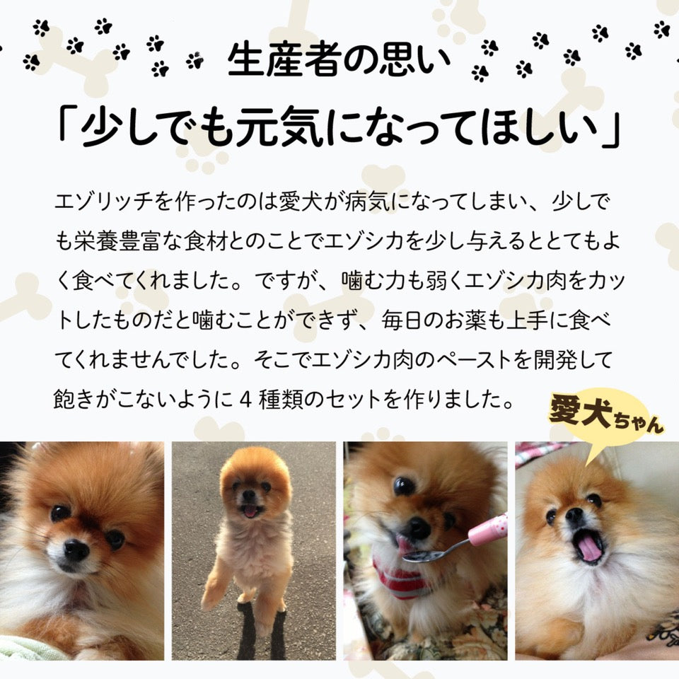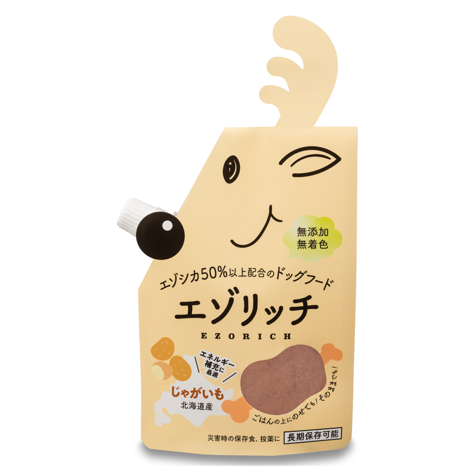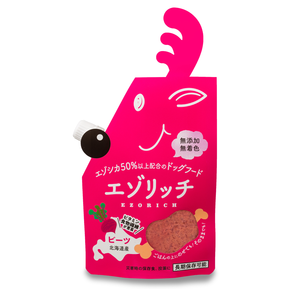愛犬が年齢を重ねるごとに食が細くなり体重が減ってきてしまったことから、栄養価が高くて低脂質なヘルシー食材エゾシカ肉をペースト状にして与えたところ大変喜んで食べてくれたので、エゾリッチの開発を始めました。