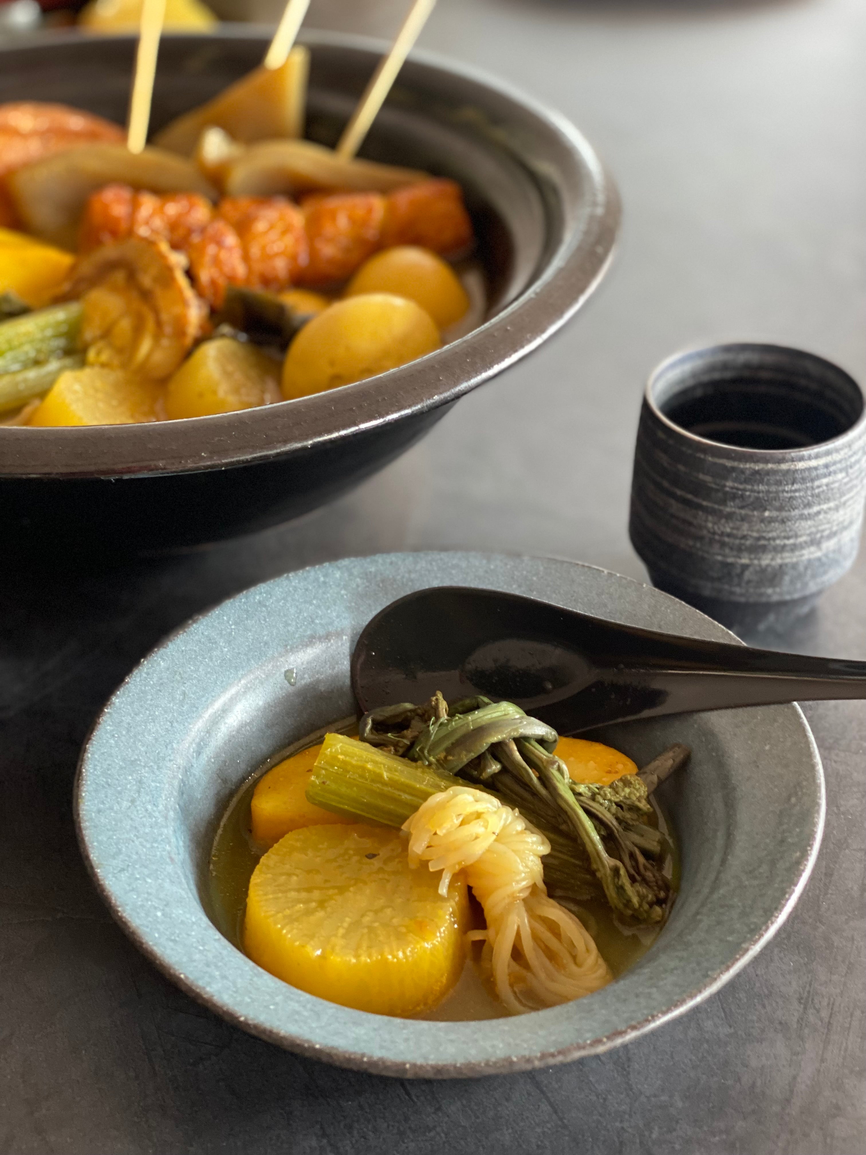 ①中袋(レトルトパウチ)と具材の封を切らずに袋ごと沸騰したお湯の中に入れて、3〜5分間温めてください。