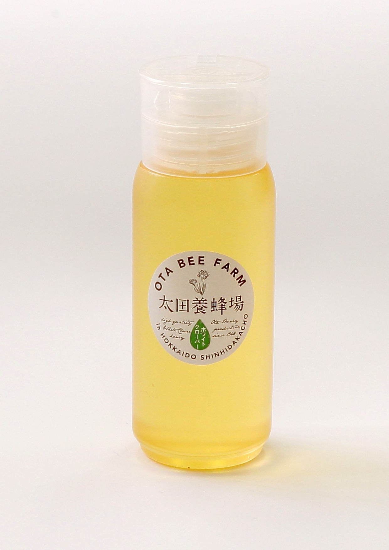 初夏、北海道日高の広大な牧草地に広がるホワイトクローバーの花からミツバチたちが集めてきたはちみつ。ほのかな酸味が爽やかな味わいで、太田養蜂場人気No. 1の商品です。