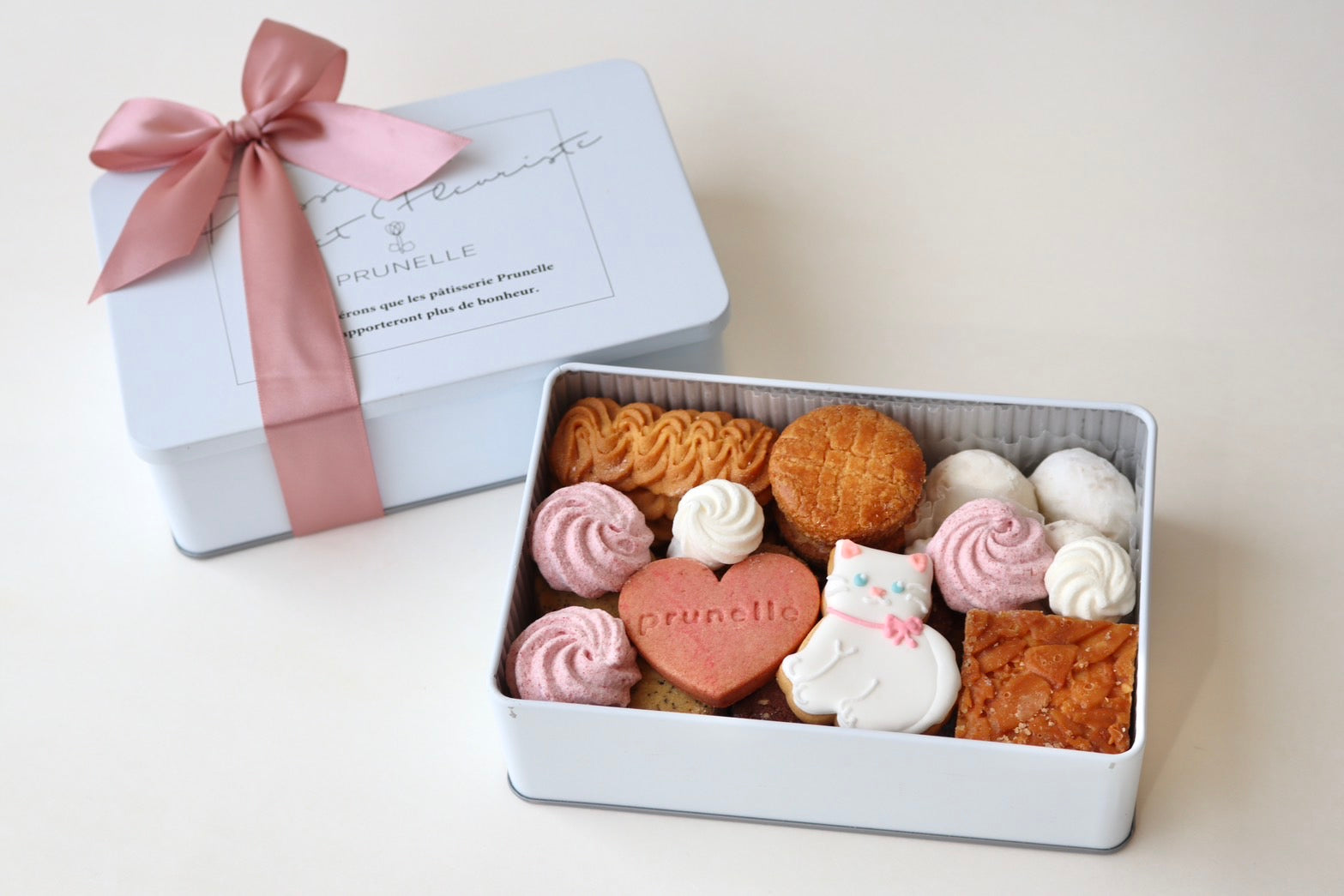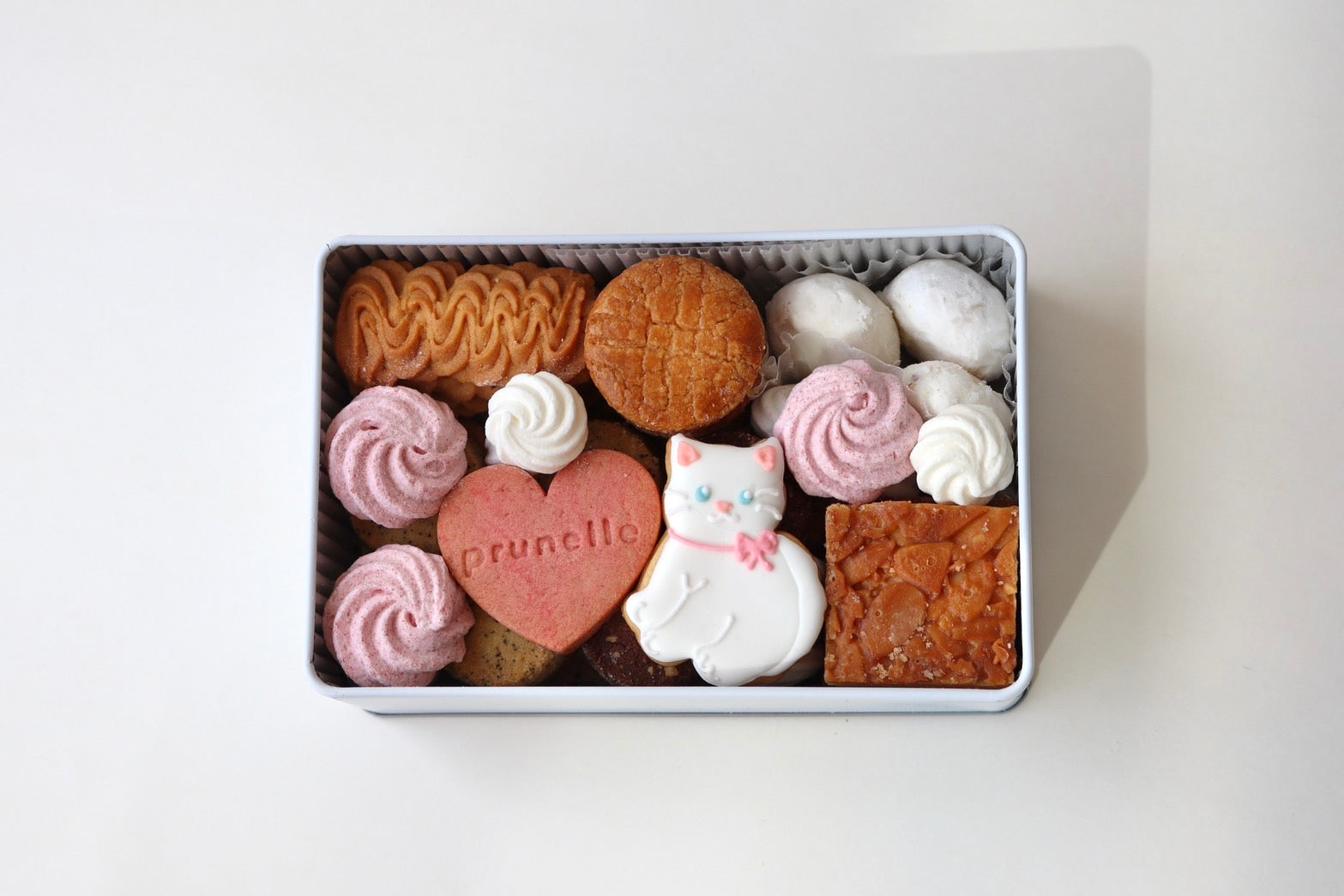 プリュネルのオリジナルキャラクター「プリュねこ」のアイシングクッキーと「prunelle」のロゴ入りハートサブレが入った見た目にもかわいいクッキー缶です。
